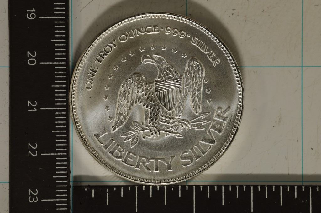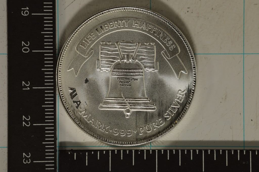 SILVER, "LIFE LIBERTY HAPPINESS" THE LIBERTY BELL ON REVERSE, IN HARD PLASTIC CAPSULE