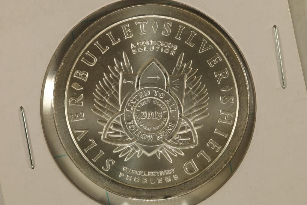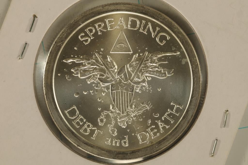 BULLET, SILVER SHIELD" ON OBVERSE AND SPREADING DEBT AND DEATH ON REVERSE