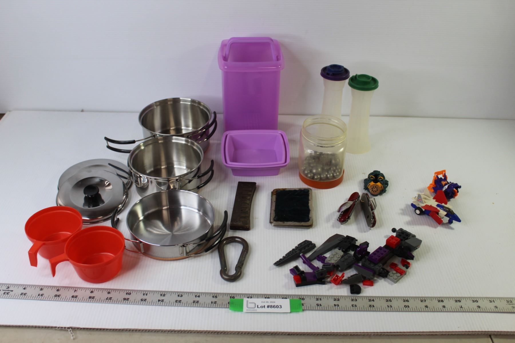 (1) Three-In-One Camping Cook Pot with Tote, Tupperware Plunge Kit, Plastic Salt And Pepper Shakers, Ball Bearings, Antique Needle Holder, Lego Blocks, Children's Toys etc. - As is