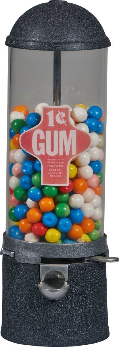 Pat. 1927. Black cast aluminum base and lid. Push in coin slide coin entry. Cylindrical globe with "1 Cent Gum" decal. Condition (Very Good). Size 13-1/2" x 4-3/8".