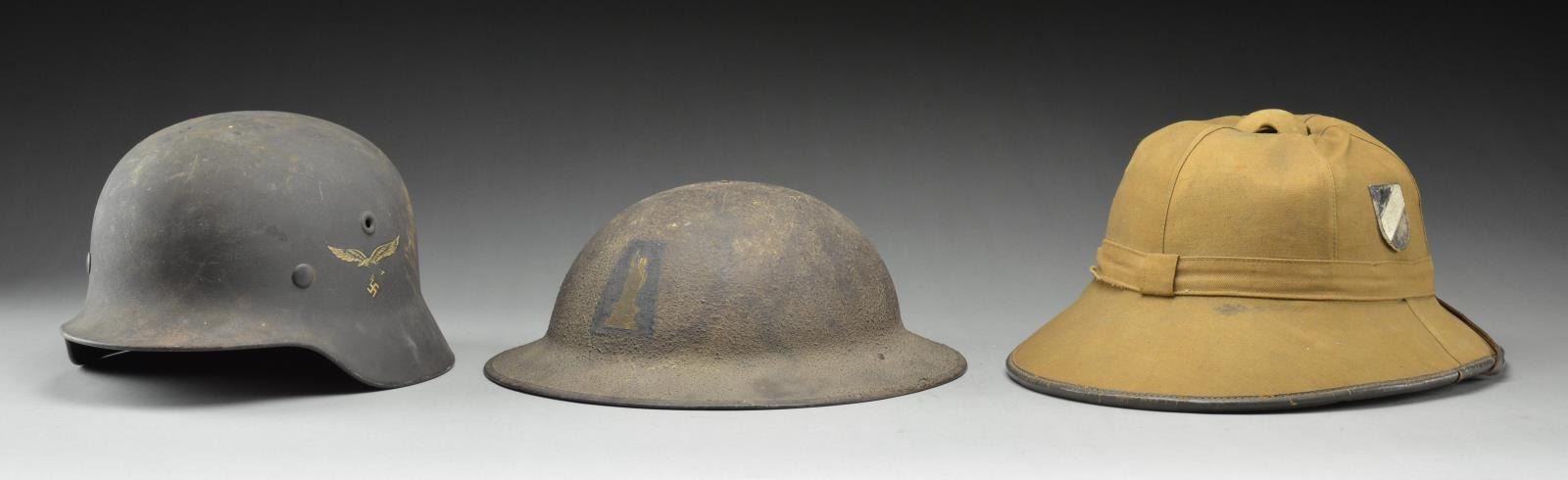 3) German M34 gladiator style helmet. Blue finish w/ German eagle Party symbol on right. Interior rim of helmet stamped "135" & Q64". Brown leather liner w/ circle "56" stamp. CONDITION: Exterior in fair condition w/ dark brown patina, marks & spots of paint. decal missing some of its finish. good intact liner w/ staining. (02-16923/MD). $100-200