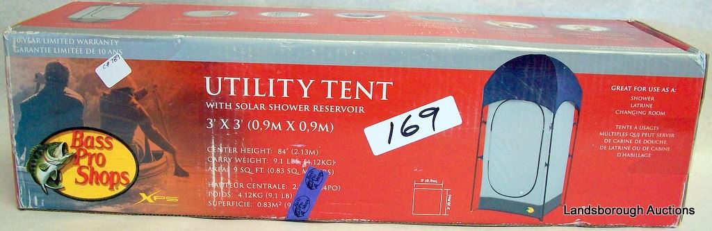 ONE BASS PRO UTILITY TENT WITH SOLAR SHOWER RESEVOIR AND WORLD FAMOUS PORTABLE TOILET.
