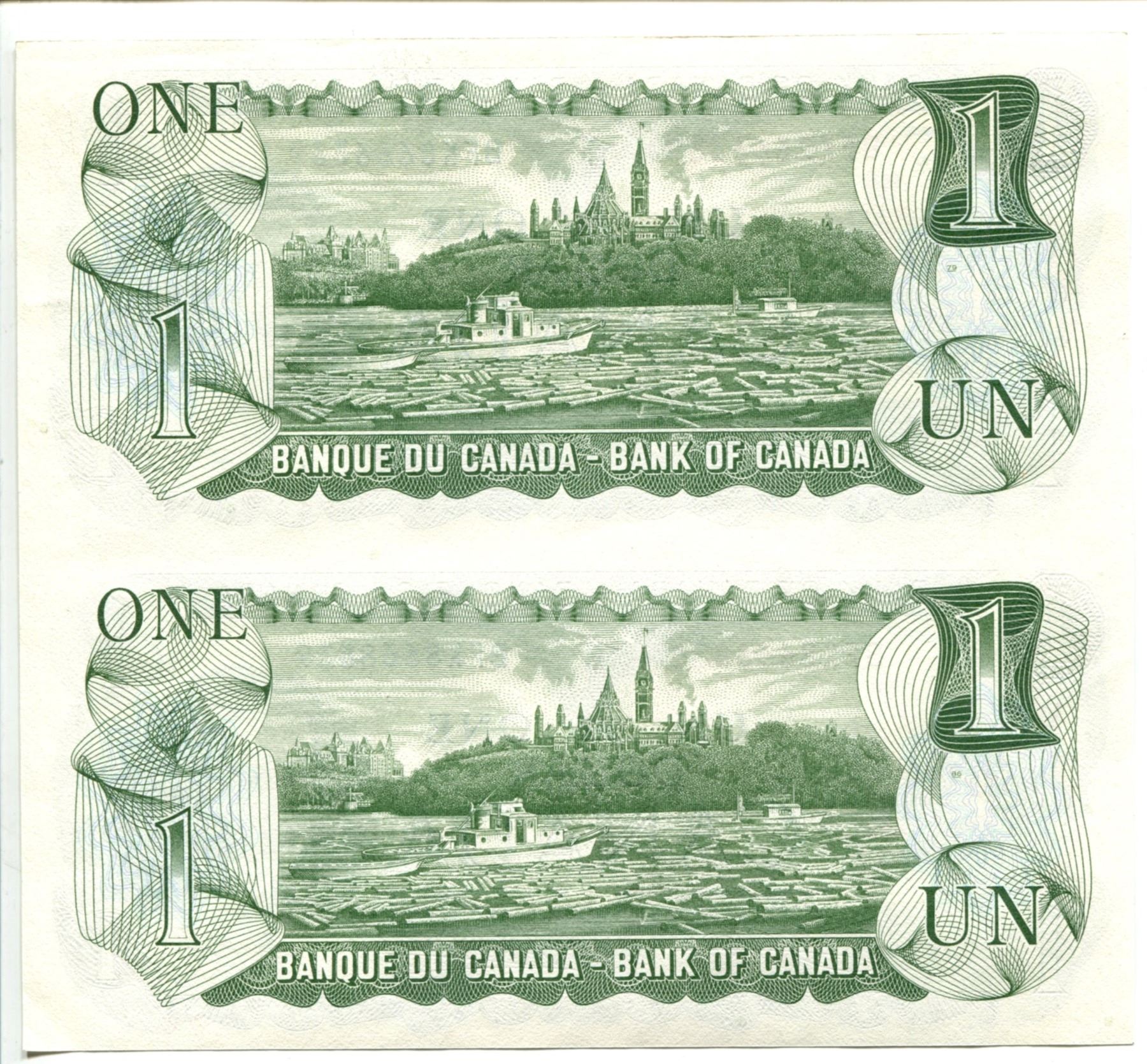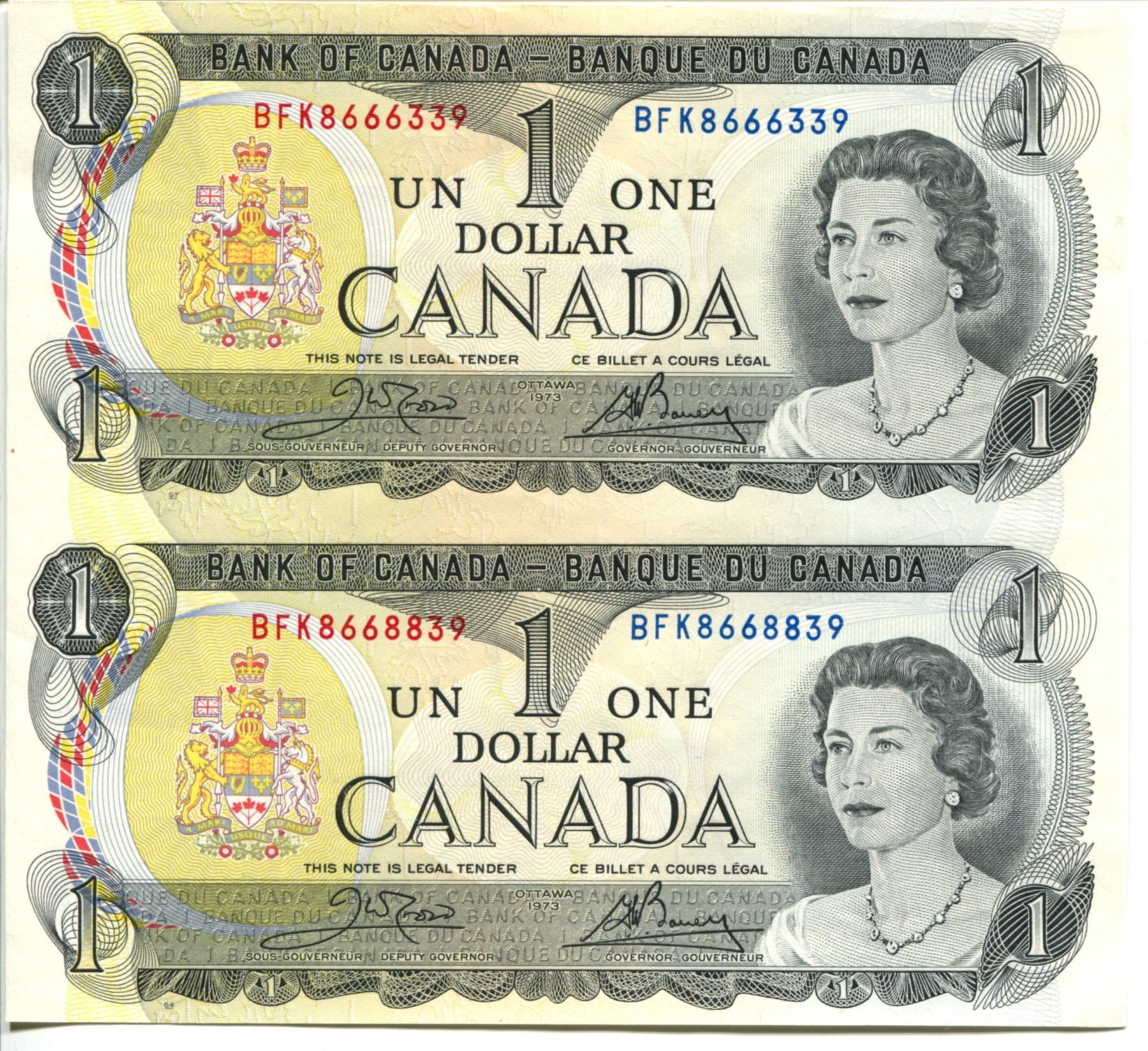 1-Uncut sheet of 2 -1973 Canadian One Dollar bills (Crow/Bouey) BFK8666339 & BFK8668839),1-uncut sheet of 2 - one dollar bills
