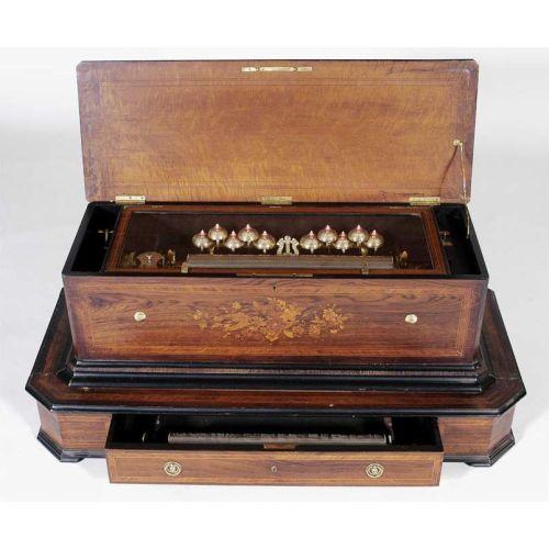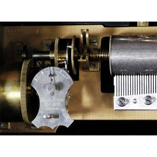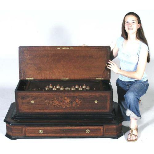 1 VERY LARGE NICOLE FRERES<BR>INTERCHAGEABLE CYLINDER MUSIC<BR>BOX<BR>46" long x 22" deep x 19" high<BR>with inlaid case<BR>also playing ten bells<BR>the pinned portion of each<BR>cylinder 19 1/4" long<BR>circa 1880 <BR>CONDITION REPORT: plays beautifully. The armature that would be the start lever appears to be lacking (there is an unused slot on the right side), although there is a "start/stop" on the governor, perhaps it was always that way. Includes two total cylinders- so at least one is lacking (3 spaces in drawer). A few very minor veneer chips to lid, otherwise cosmetically excellent.<BR>PACKING AND SHIPPING -see recommended.