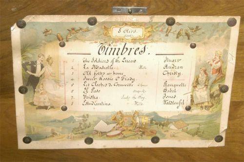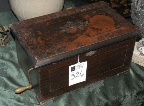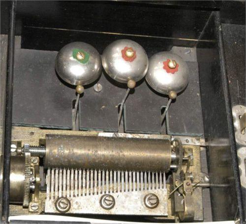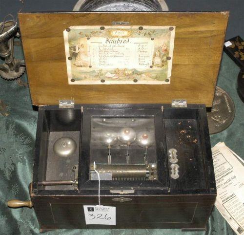 1 VICTORIAN CYLINDER MUSIC BOX, with 3 bells, 4 1/2" cylinder, late 19th century, CONDITION: as found, dirty and with well worn lid, but plays fine, teeth all intact and retains song sheet under lid. PACKING AND SHIPPING BY FAIRFIELD AUCTION WITHIN CONTINENTAL USA (excluding insurance) $45