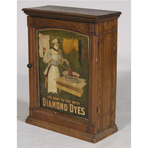 1 VICTORIAN DIAMOND DYES CABINET circa 1900 PACKING AND SHIPPING must be handled by 3rd party shipper. CONDITION REPORT: surface wear, fading, stains, scratches.