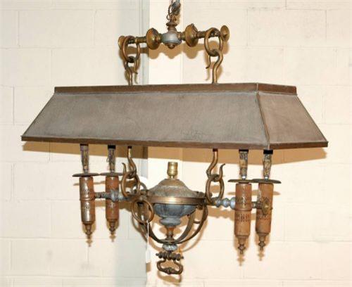 1 VICTORIAN OIL LIGHT BILLIARDS LAMP, now converted to electricity, patina stripped off, 36" long, late 19th century