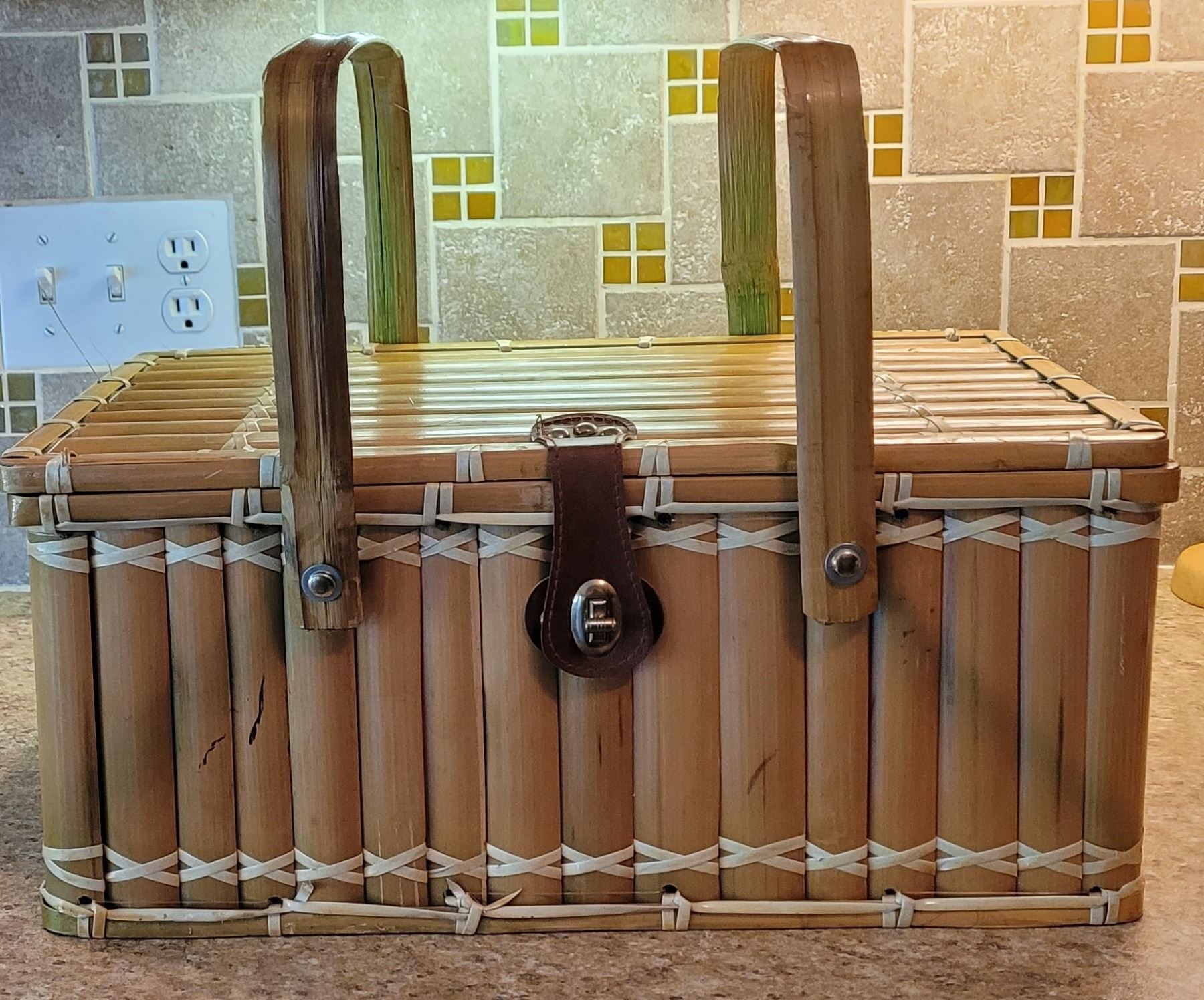 PICNIC BASKET AND DISHES, BOWLS, CUPS, CUTLERY & SALT AND PEPPER SHAKERS. HOUSEHOLD