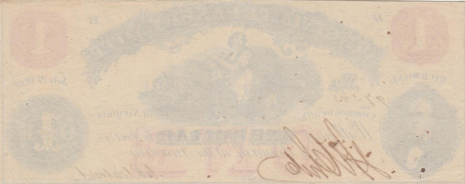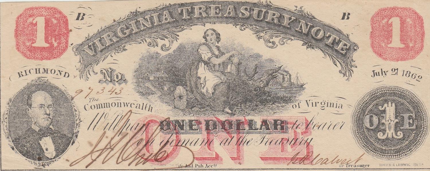 $1 VIRGINIA TREASURY NOTE 1862 BOLD HIGH GRADE