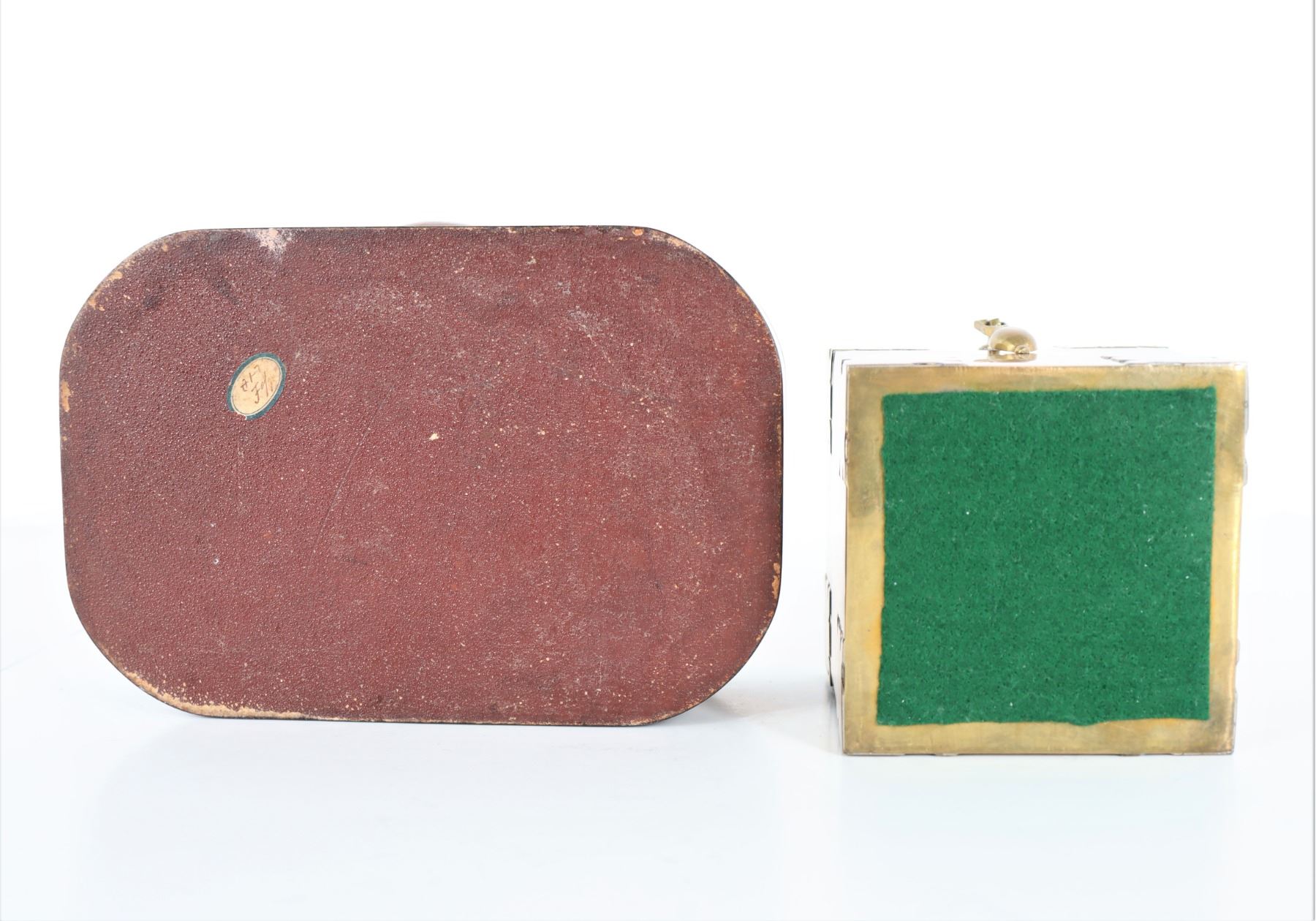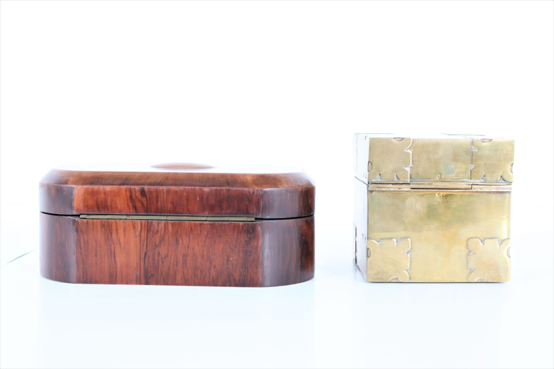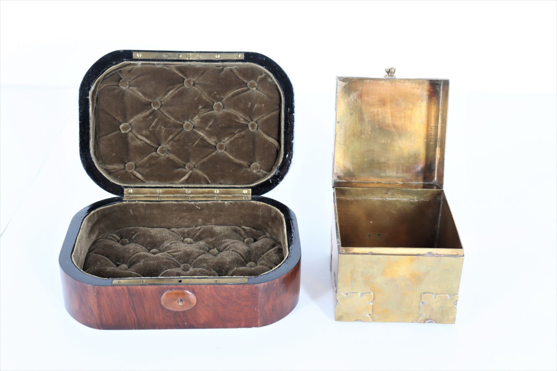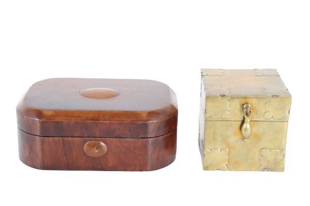 Two Late 1800’s, Early 1900’s boxes. Beautiful wooden Victorian jewelry box lined with green velvet, rectangular shape with rounded ends, paper label on bottom, no key. Second box is made of brass with Asian flair to it. Handsome and sturdy. The Victorian jewelry box measures 8 1/4 x 3 1/4 in. high x 5 1/2 in. deep and the smaller Asian style box measures 4 x 4 x 4 in. deep.