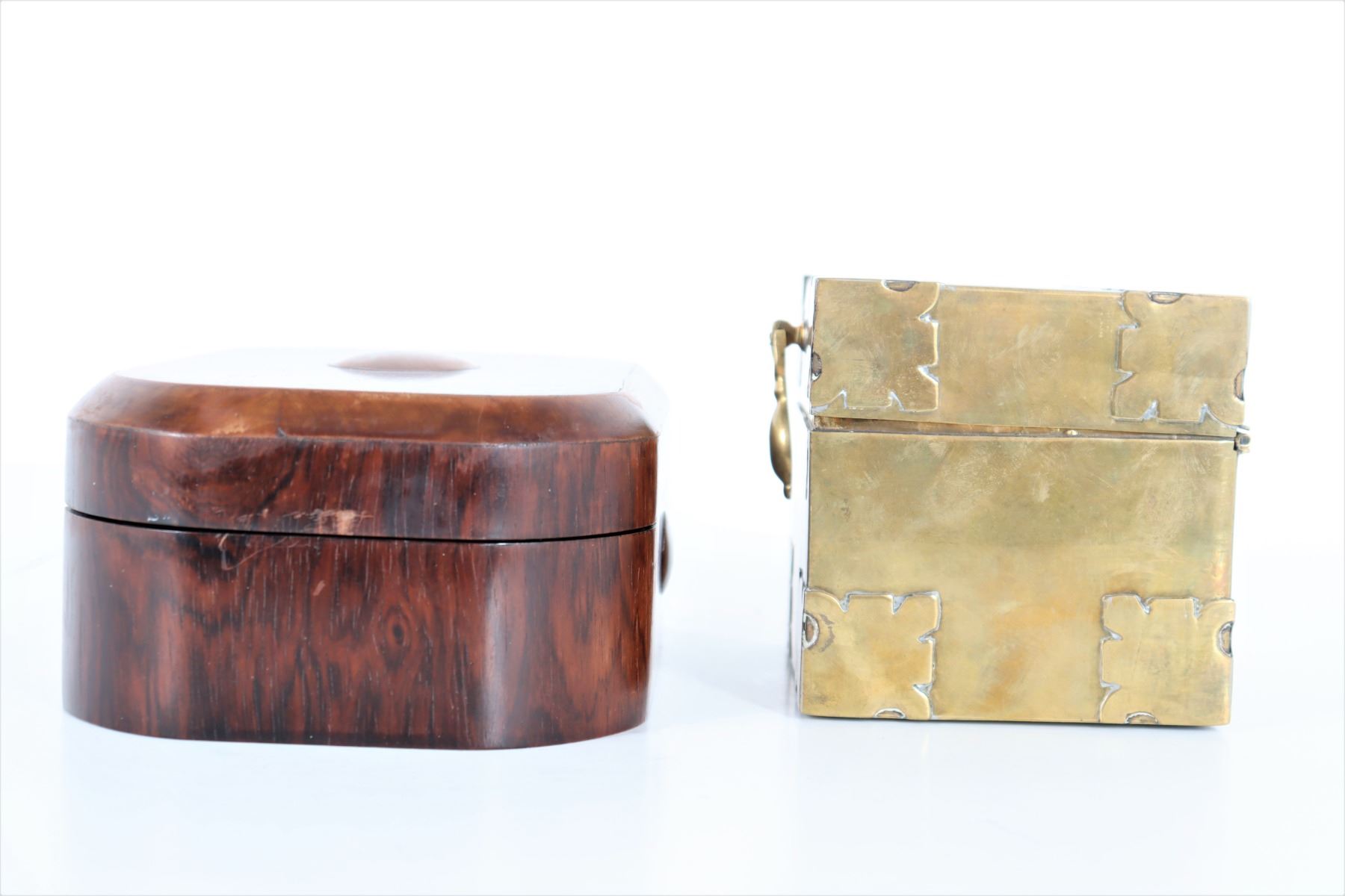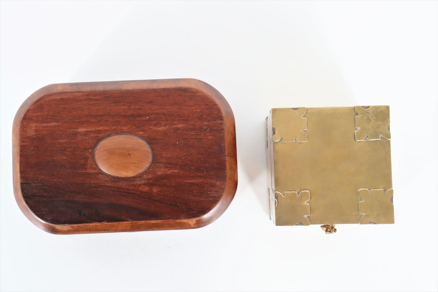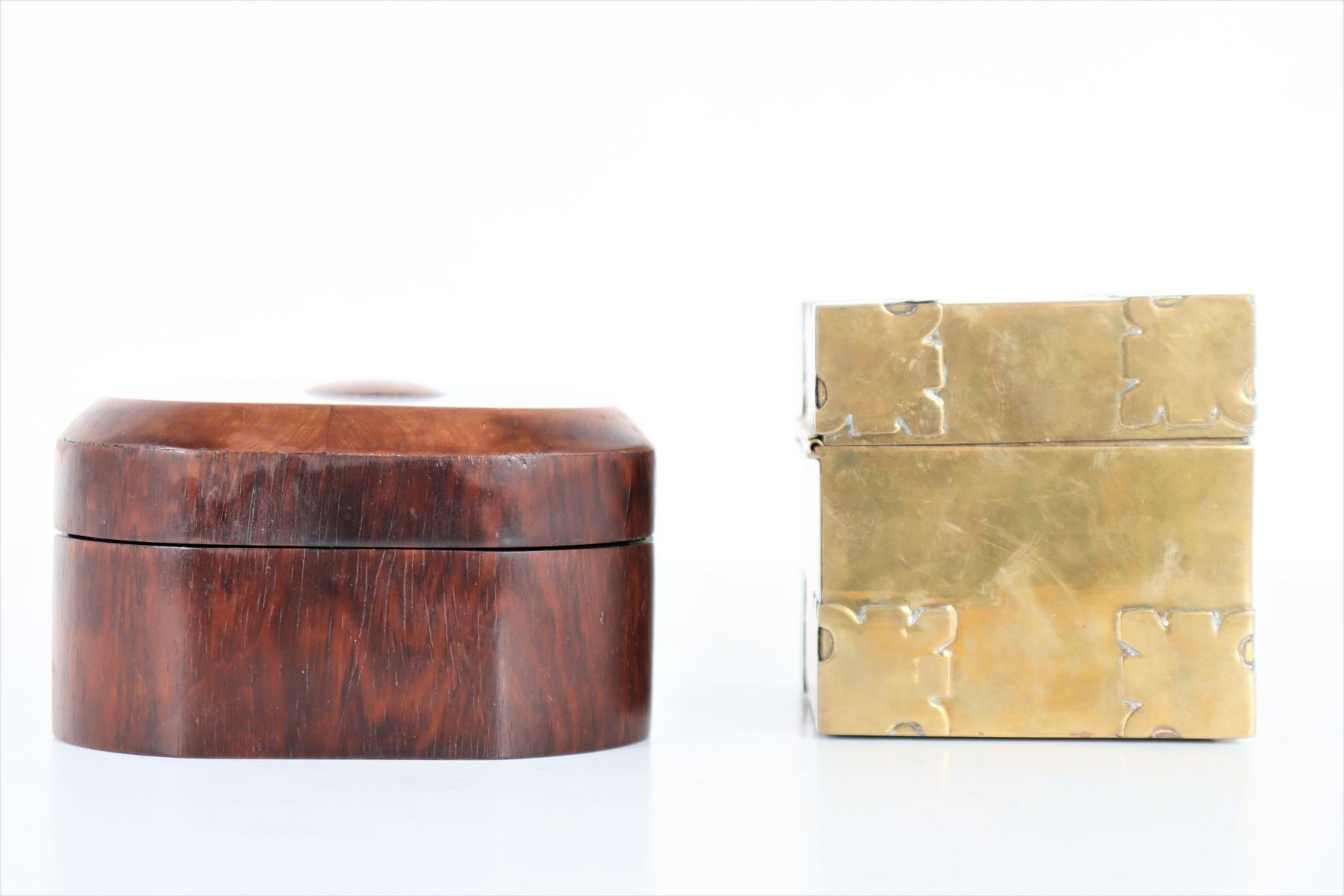 Two Late 1800’s, Early 1900’s boxes. Beautiful wooden Victorian jewelry box lined with green velvet, rectangular shape with rounded ends, paper label on bottom, no key. Second box is made of brass with Asian flair to it. Handsome and sturdy. The Victorian jewelry box measures 8 1/4 x 3 1/4 in. high x 5 1/2 in. deep and the smaller Asian style box measures 4 x 4 x 4 in. deep.