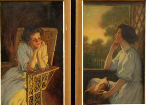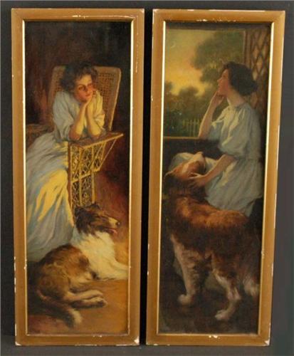 1 WARREN B. DAVIS, a pair, each 27"x9" oil on canvas, depicting a glamorous woman with her dog, early 20th century, packing and shipping $50