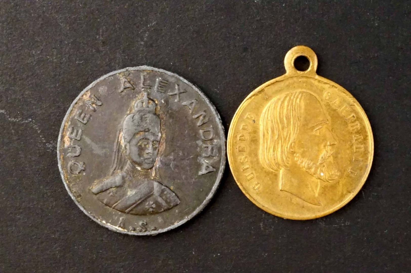 One Medal white metal. Edward VII and Alexandra "Made in France" and one Medalet of Garibaldi, in French