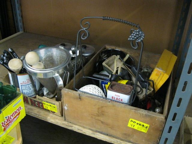 1 WOOD BOX AND FLAT OF MISC KNIVES, FLOUR SIFTER AND KITCHEN UTENSILS