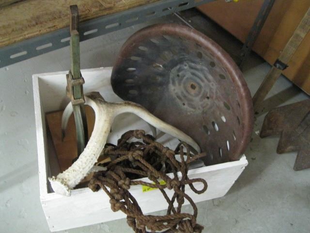 1 WOOD CRATE WITH TRACTOR SEAT, ANTLERS, ETC
