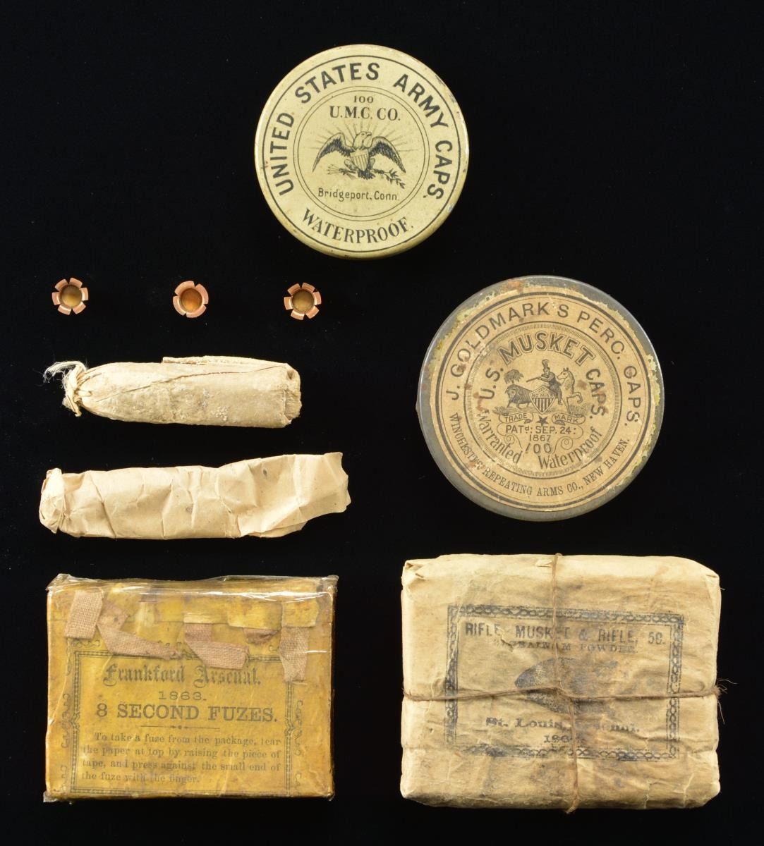 WAR BULLETS, ARTILLERY FUSES, CAP TINS & MORE. This lot includes 1 wrapper only for a package of 58 caliber musket rounds from the St. Louis Arsenal. / 1 Package of Frankfurt Arsenal 8-second artillery fuses dated 1863 with a yellow wrapper. / 2 Post-Civil War tins for US musket caps. / 1 Paper wrapped 58 caliber cartridge. / 1 Paper package of musket caps. CONDITION: wrapper shows fading & dirt but is complete. Fuses show wear but are also complete. Tins have light wear. Bullet & caps show light to moderate wear. PROVENANCE: From the Lifelong Collection of Glen E. Mattox. (02-18658/BF). $250-400.