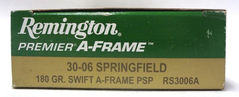 1 box Remington Premier A-Frame 20 Centerfire Rifle Cartridges. 30-06 Springfield. Length - 3 1/4".