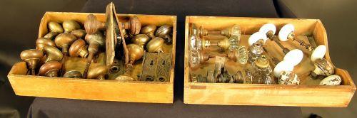 1 box lot of misc Antique door knobs, Glass, Brass & Porcelain...11 glass, 6 porcelain and 24 brass.... also, 2 etched brass panels