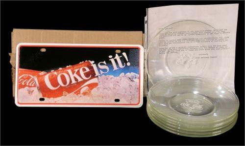 1 box of 25 "Coke is it" license plates, a set of 7 glass 8", round Coca-Cola dishes used as giveaway items in the 1940's with a letter of authentication attached.