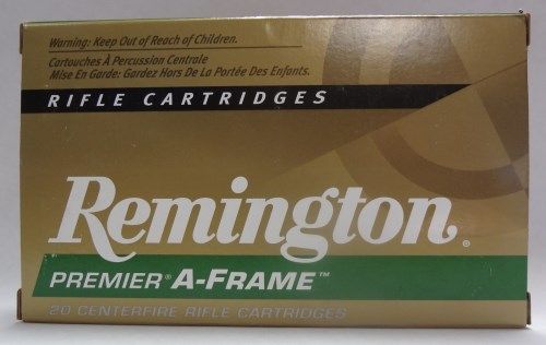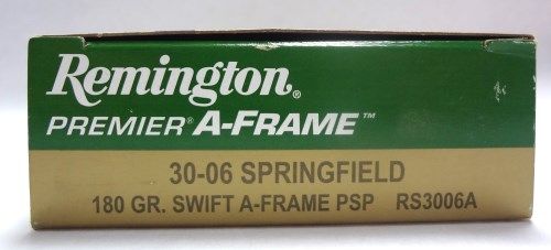 1 box of Remington Premier A-Frame Rifle Cartridges. 30-06 Springfiled. 180 GR Swift A-Frame PSP. Length - 3 1/4". The most reliable cross-membered bullet made today,