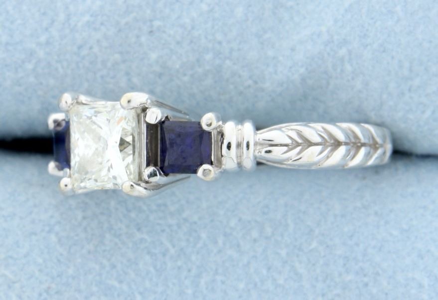 Stunning 1 carat Princess cut "Leo" Diamond. The diamond weighs 1.00 carat and is VVS-2 clarity and "I" color! Diamond is lasered, LEO145425S. See photo of GSI report of Authenticity. The diamond is set in a platinum head. On each side of the Princess cut Diamond are 2 genuine square cut sapphires, total weight is 1/2 carat. 4.8g Size 5 1/4