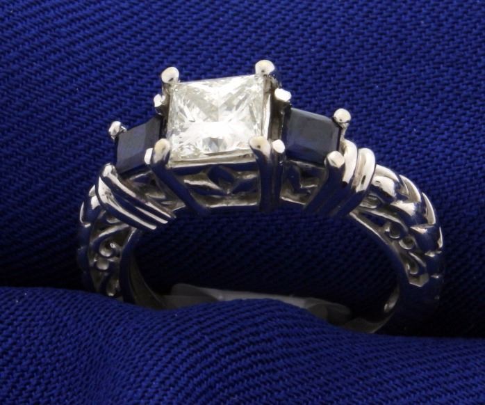 Stunning 1 carat Princess cut "Leo" Diamond.  The diamond weighs 1.00 carat and is VVS-2 clarity and "I" color!  Diamond is lasered, LEO145425S.  See photo of GSI report of Authenticity.  The diamond is set in a platinum head.  On each side of the Princess cut Diamond are 2 natural square cut sapphires with excellent color and clarity, total weight is 1/2 carat.  4.8g  Size 5 1/4