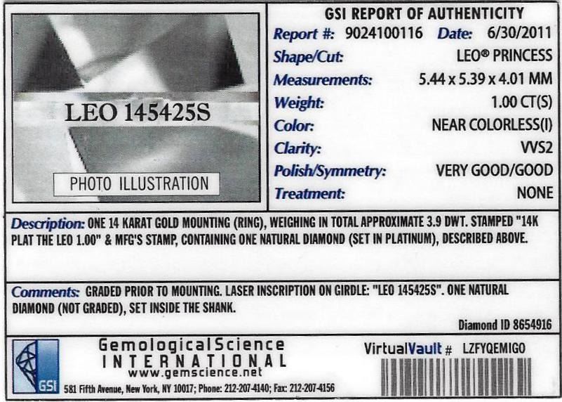 Stunning 1 carat Princess cut "Leo" Diamond. The diamond weighs 1.00 carat and is VVS-2 clarity and "I" color! Diamond is lasered, LEO145425S. See photo of GSI report of Authenticity. The diamond is set in a platinum head. On each side of the Princess cut Diamond are 2 natural square cut sapphires with excellent color and clarity, total weight is 1/2 carat. 4.8g Size 5 1/4