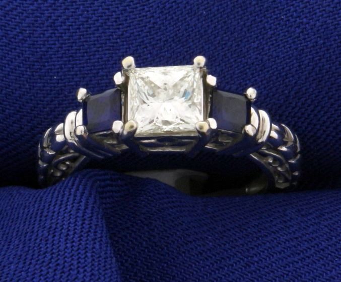 Stunning 1 carat Princess cut "Leo" Diamond. The diamond weighs 1.00 carat and is VVS-2 clarity and "I" color! Diamond is lasered, LEO145425S. See photo of GSI report of Authenticity. The diamond is set in a platinum head. On each side of the Princess cut Diamond are 2 natural square cut sapphires with excellent color and clarity, total weight is 1/2 carat. 4.8g Size 5 1/4