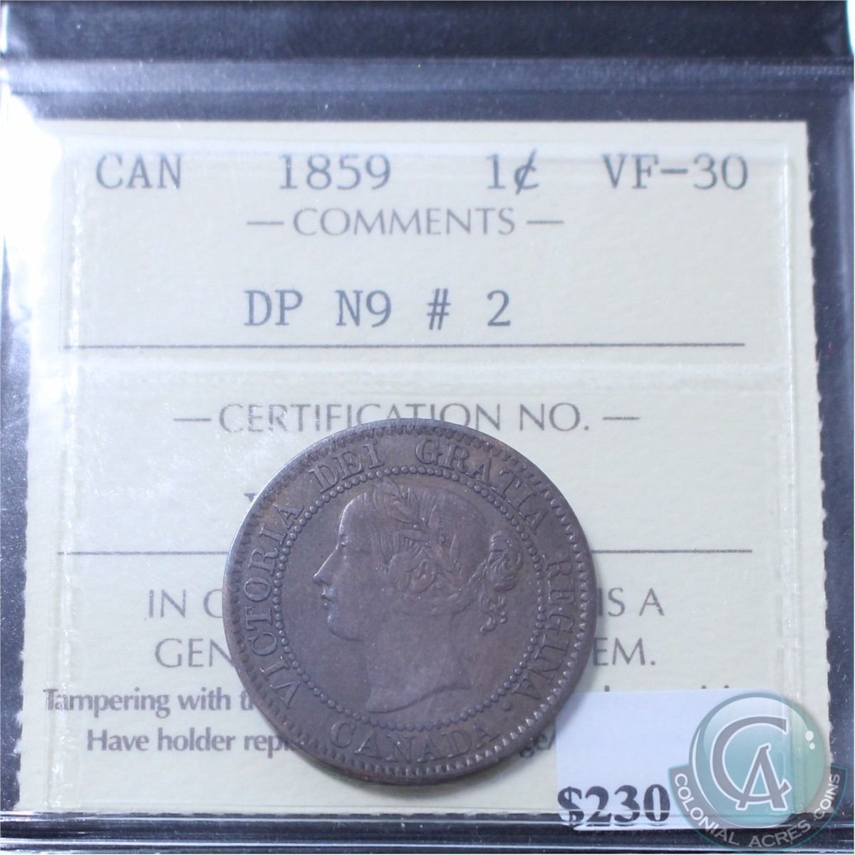 1-cent 1859 DP N9 #2 ICCS Certified VF-30