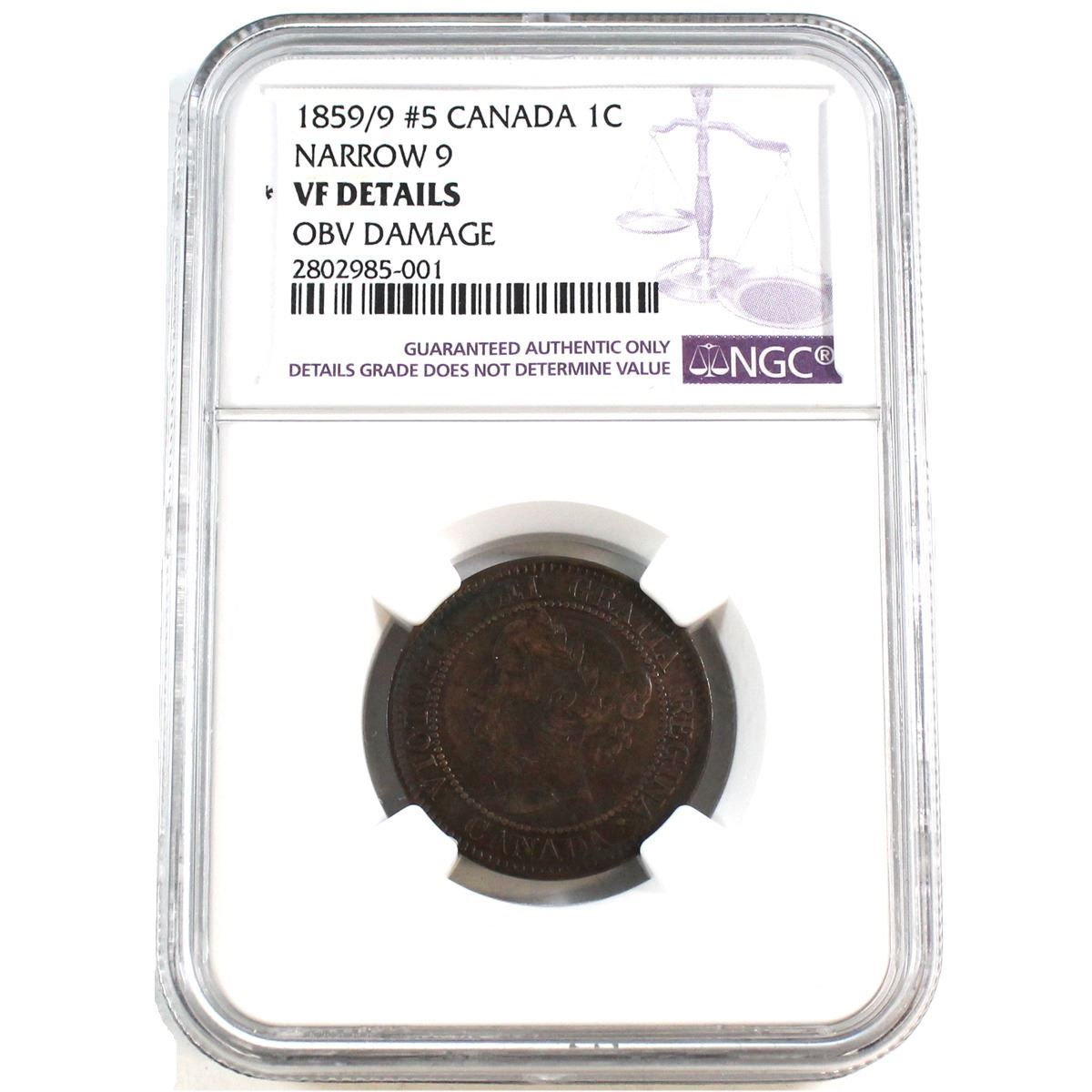 1-cent 1859 Narrow 9/9; #5; Obverse Damage NGC Certified VF Details