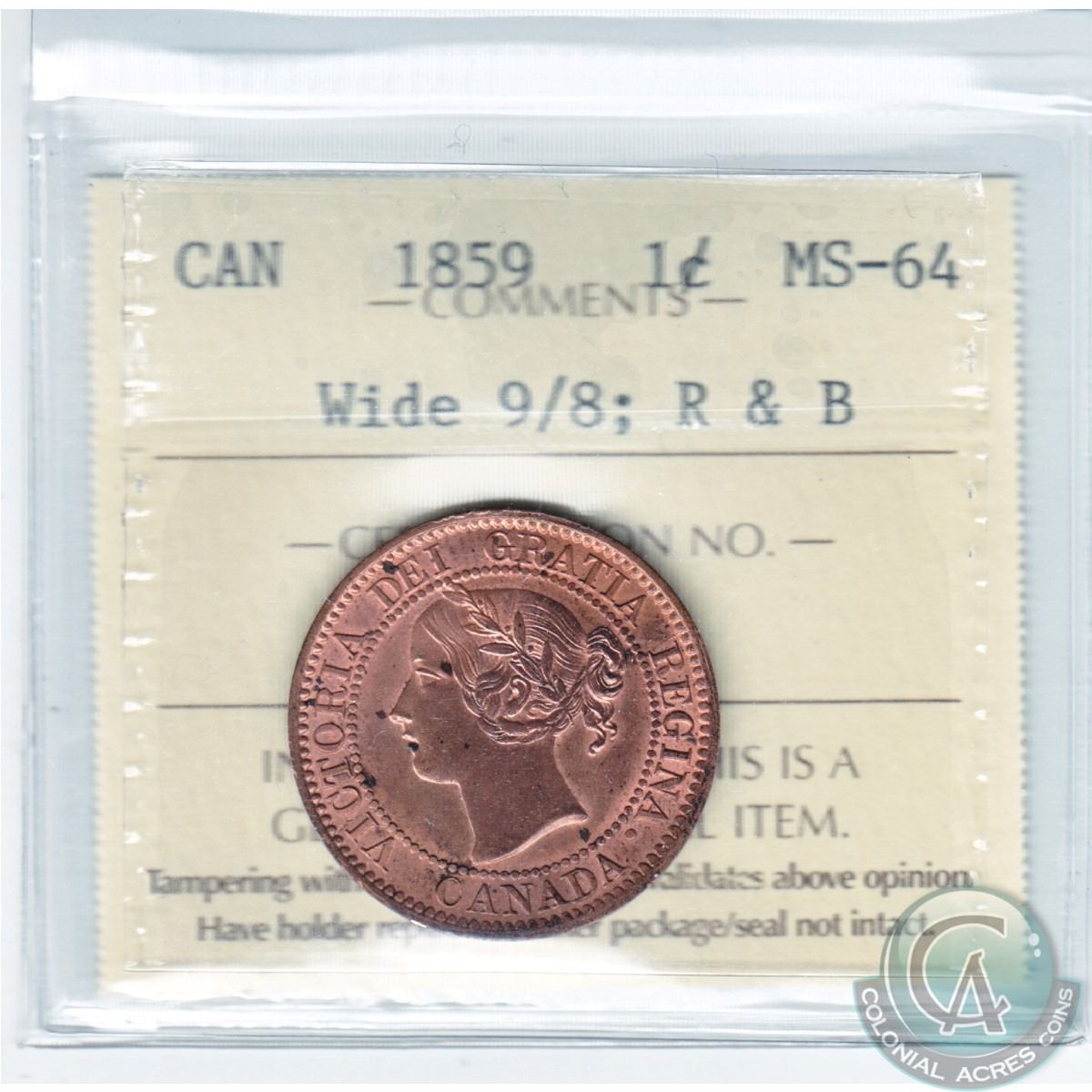 1-cent 1859 Wide 9/8 ICCS Certified MS-64 Red & Brown. A soft Lustrous coin with an attractive mint glow. A Rare coin in this grade point with only 3 ever graded higher.