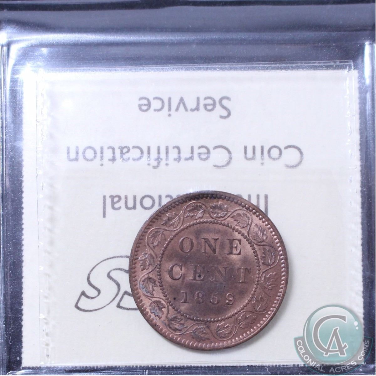1-cent 1859 Wide 9/8 ICCS Certified MS-64 Red & Brown. A soft Lustrous coin with an attractive mint glow. A Rare coin in this grade point with only 3 ever graded higher.