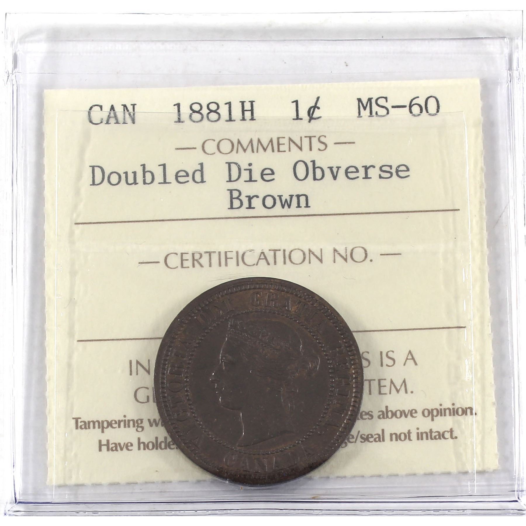 1-cent 1881-H Double Die Obverse ICCS Certified MS-60 Brown!