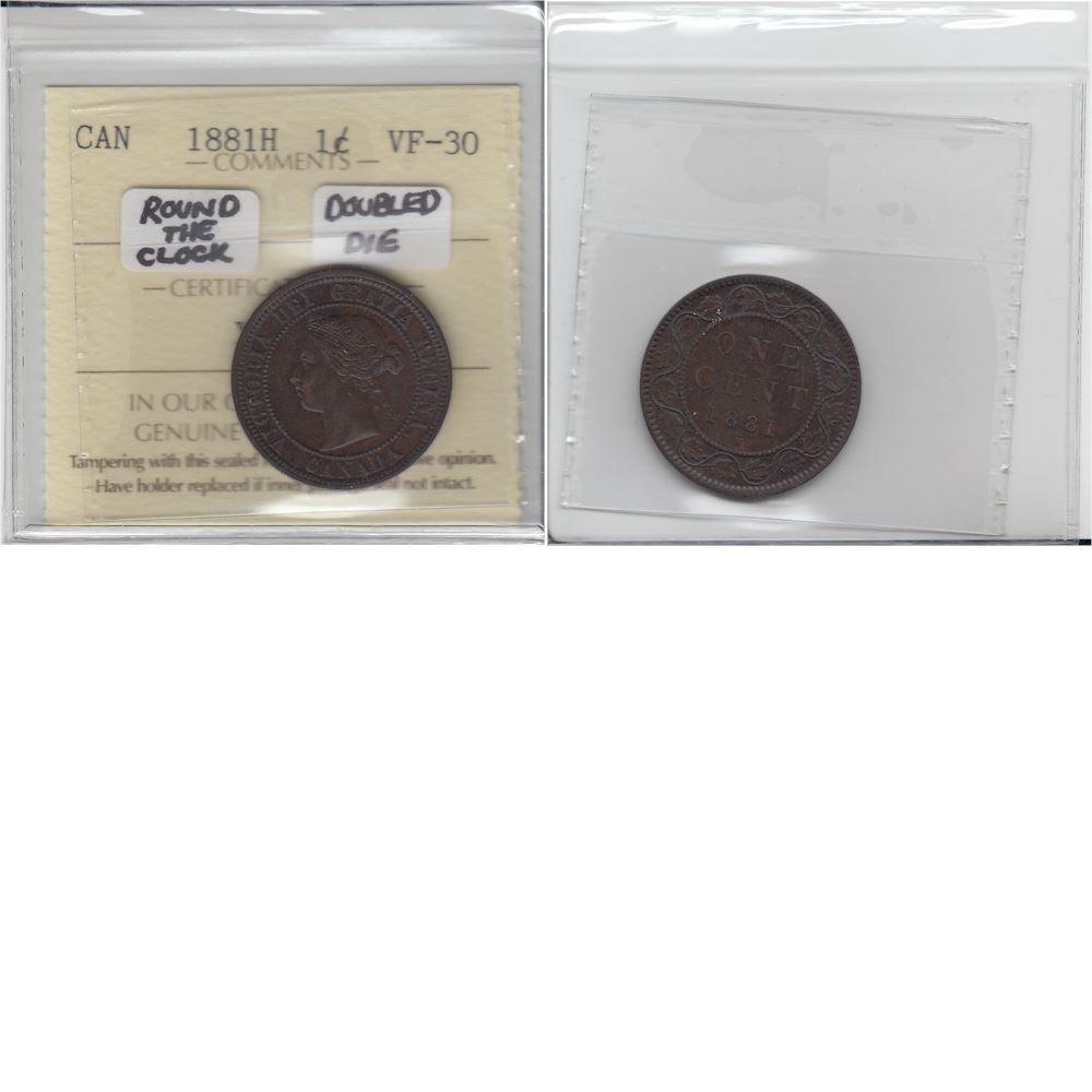 1-cent 1881H Round the Clock, Double Die; ICCS VF30