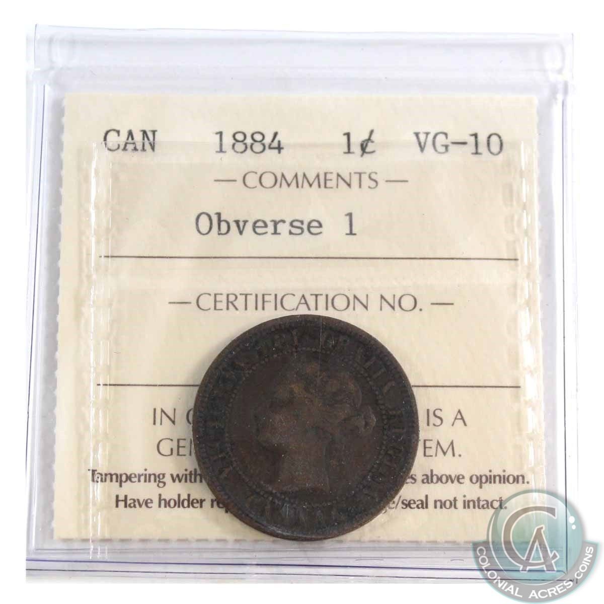 1-cent 1884 Obverse 1 ICCS Certified VG-10 *Key Date*