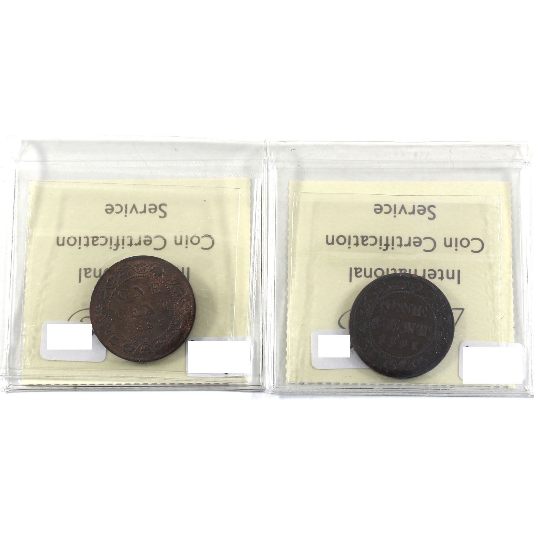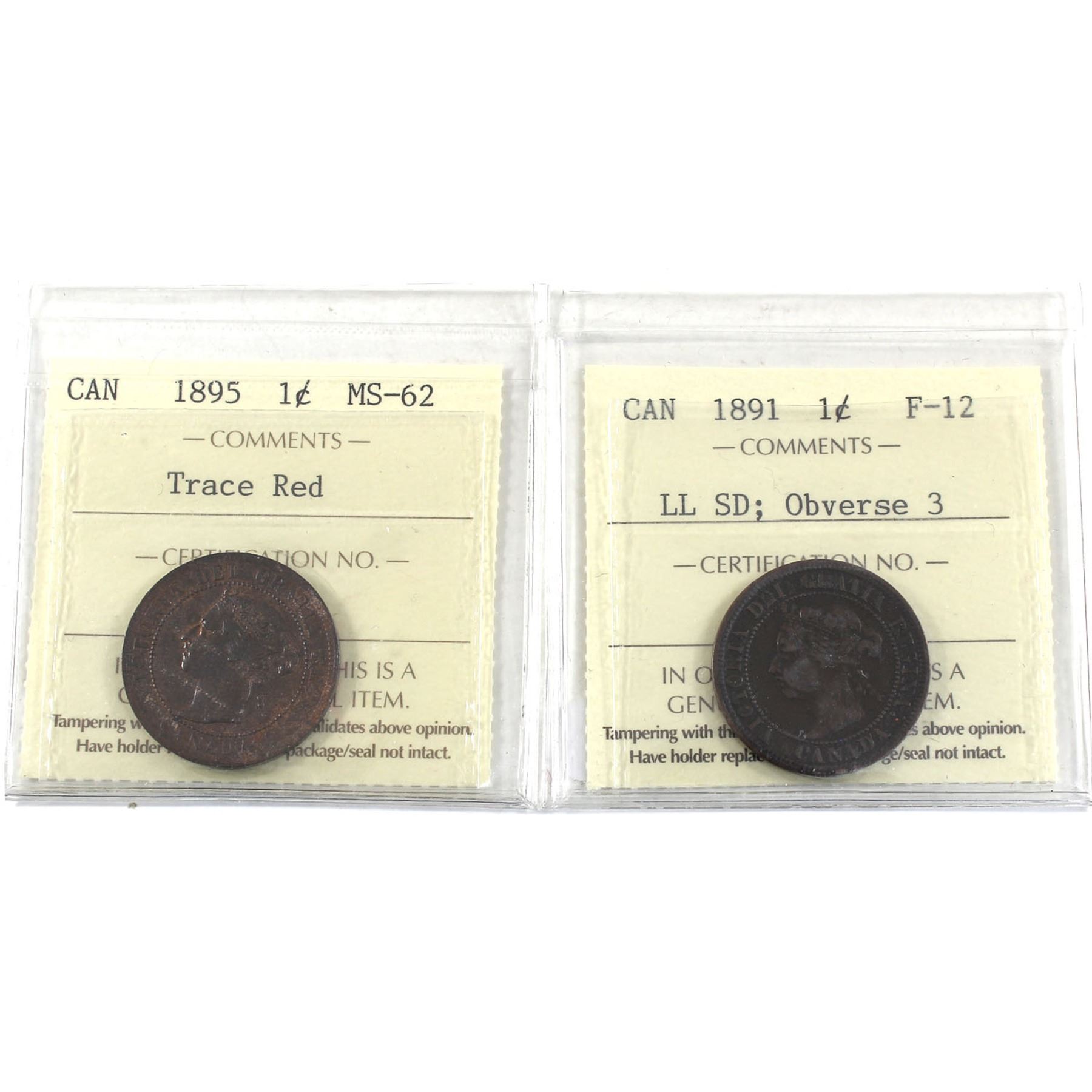 1-cent 1891 LL SD, Obverse 3 F-12 & 1895 Trace Red MS-62 ICCS Certified. 2pcs