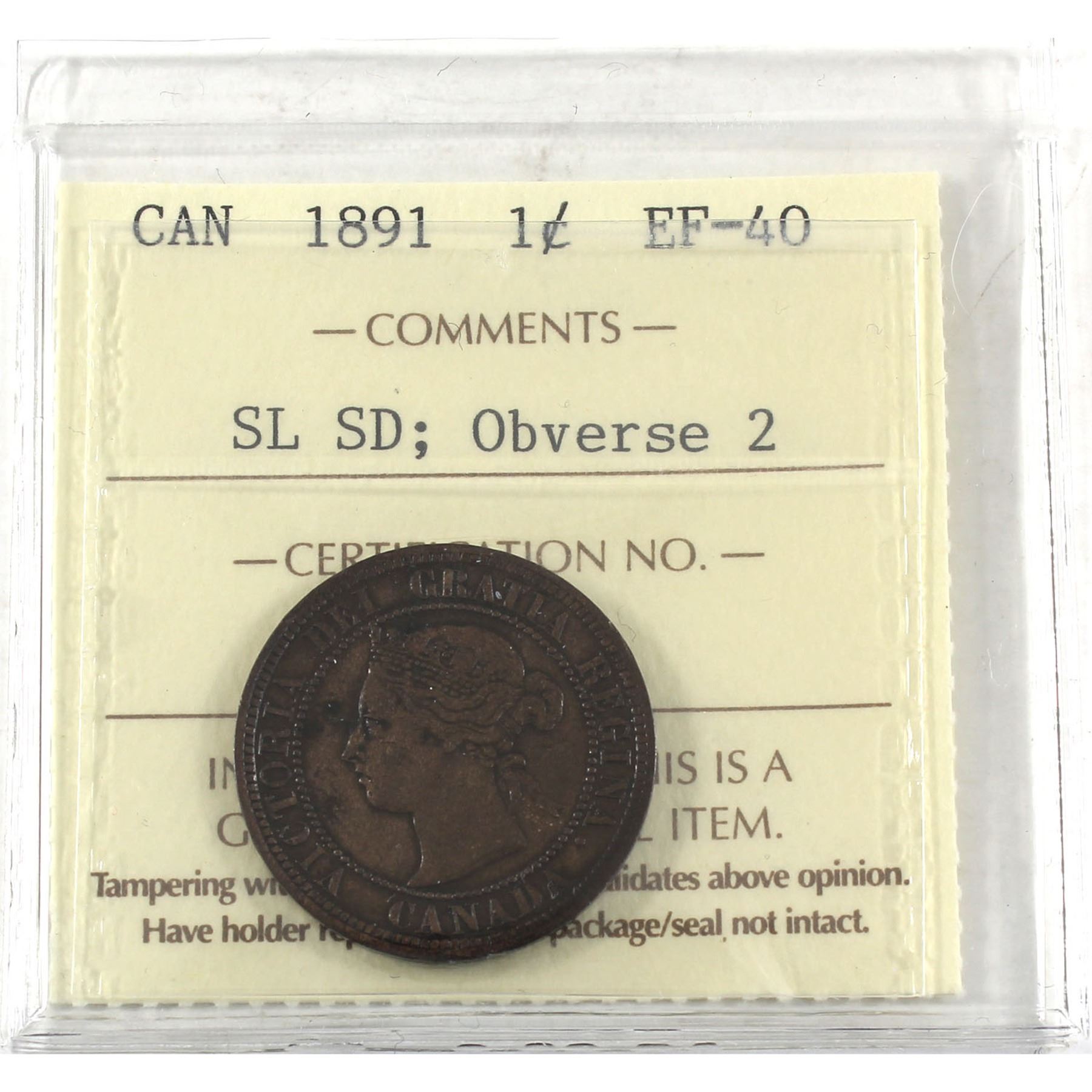 1-cent 1891 SL SD, Obverse 2 ICCS Certified EF-40