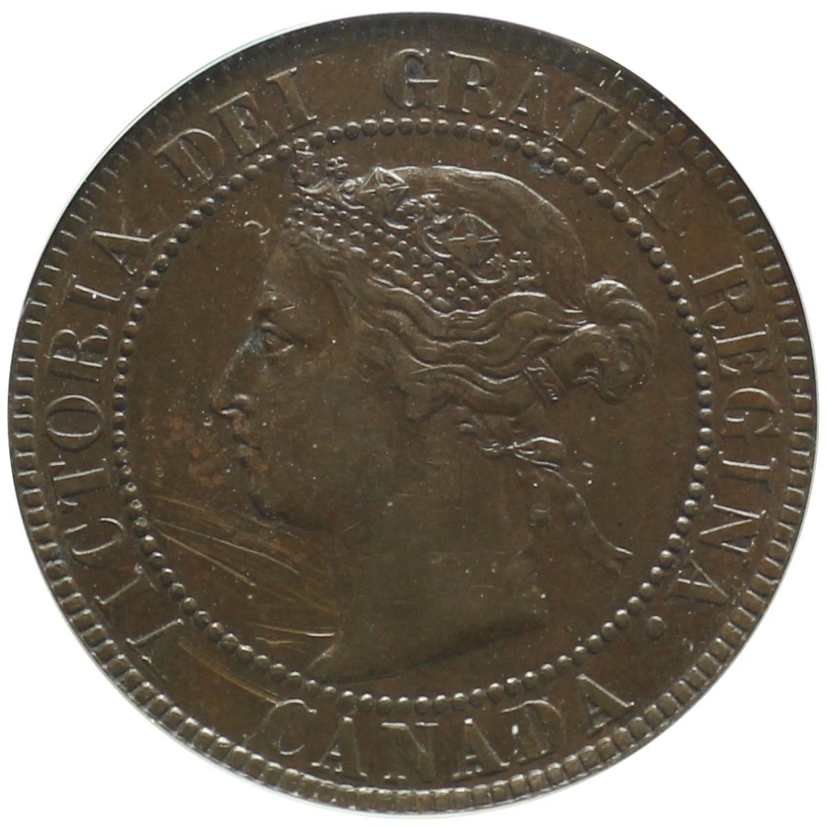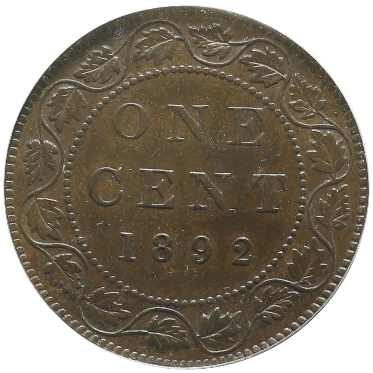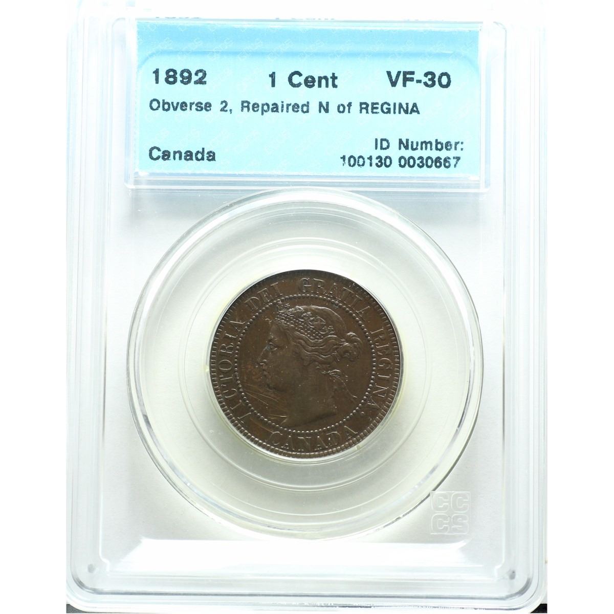 1-cent 1892 Obverse 2 CCCS Certified VF-30. Repaired 'N' of 'REGINA'.