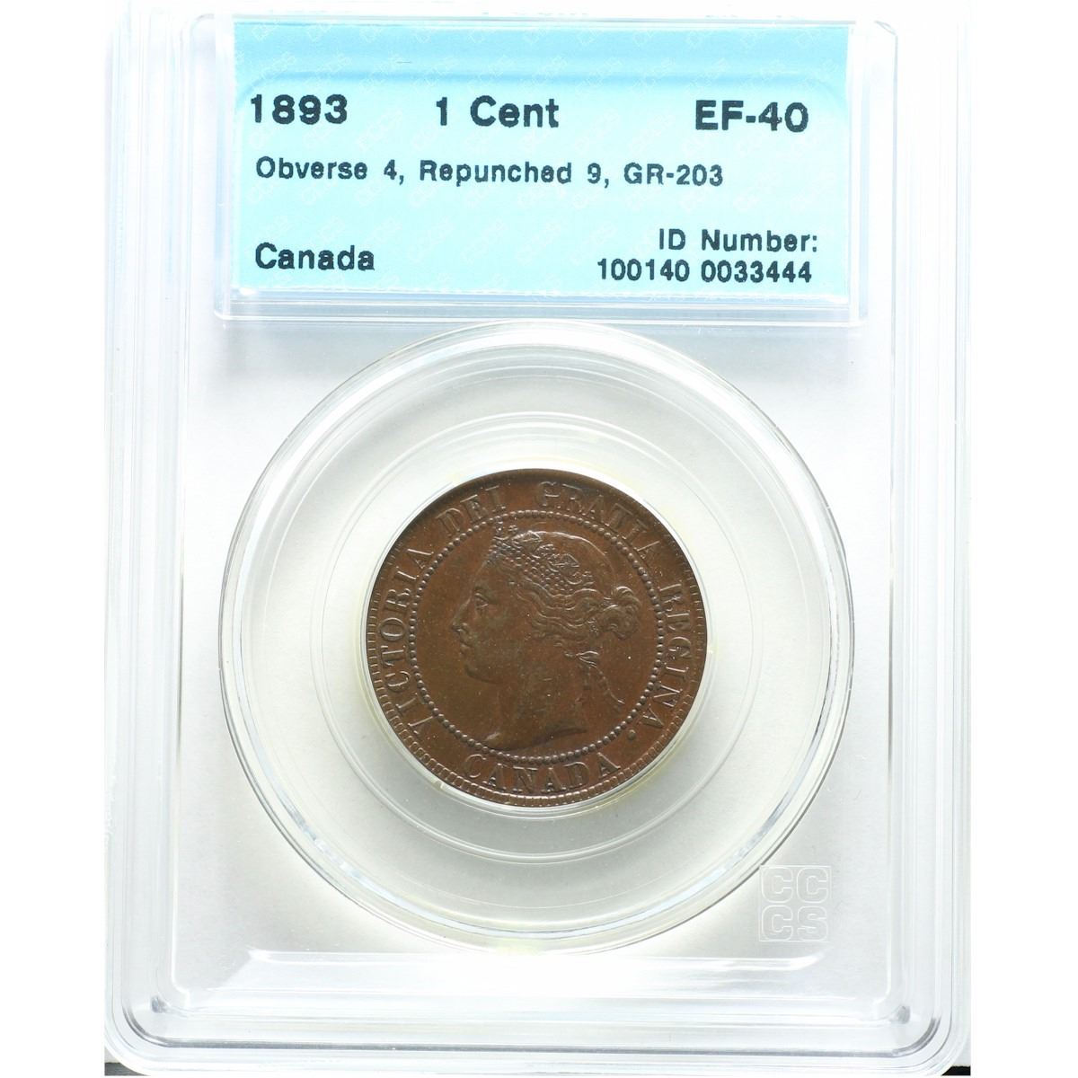 1-cent 1893 Obverse 4 CCCS Certified EF-40. Repunched 9/9, Right/Left. GR-203