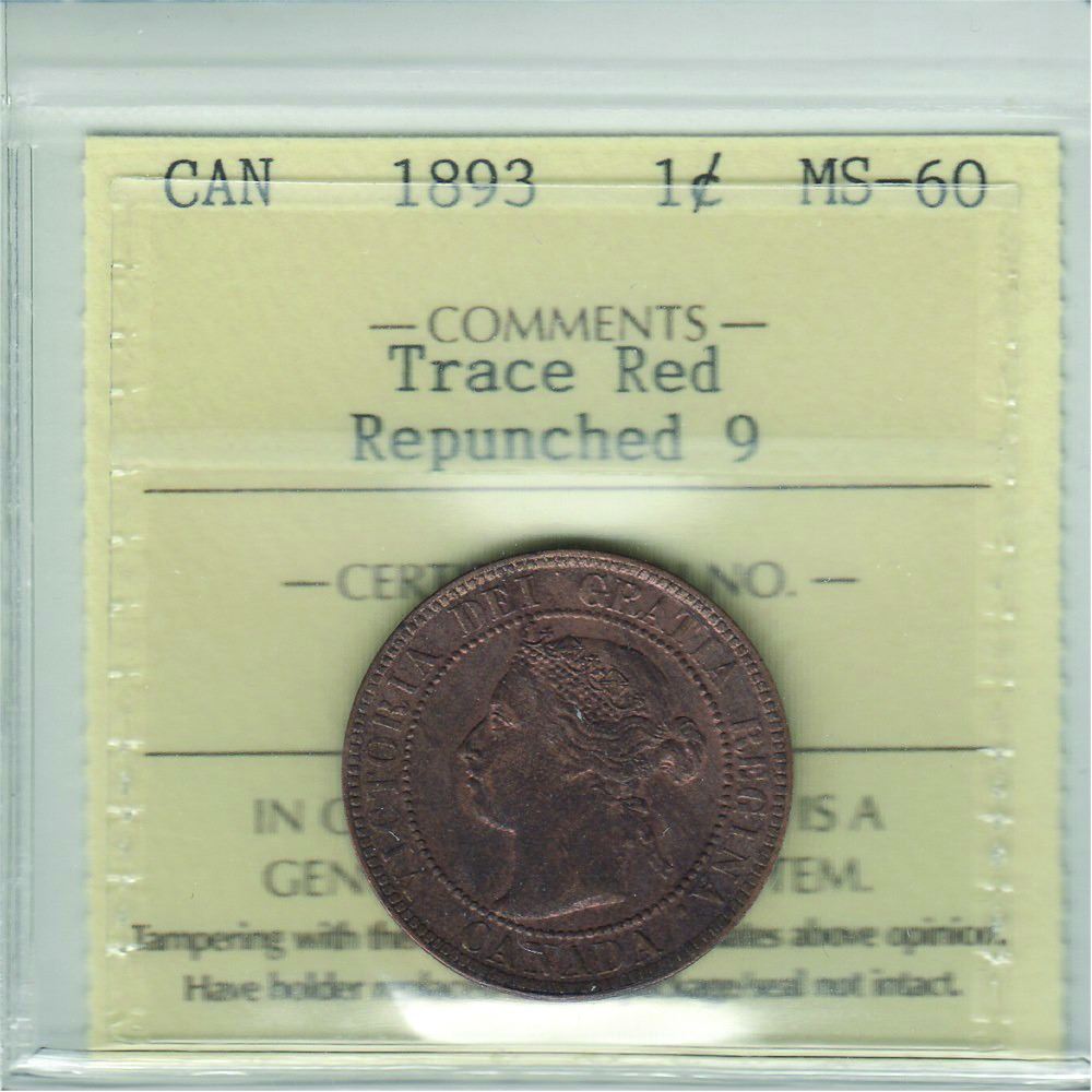 1-cent 1893; Repunch 9, ICCS certified MS-60 Trace Red.