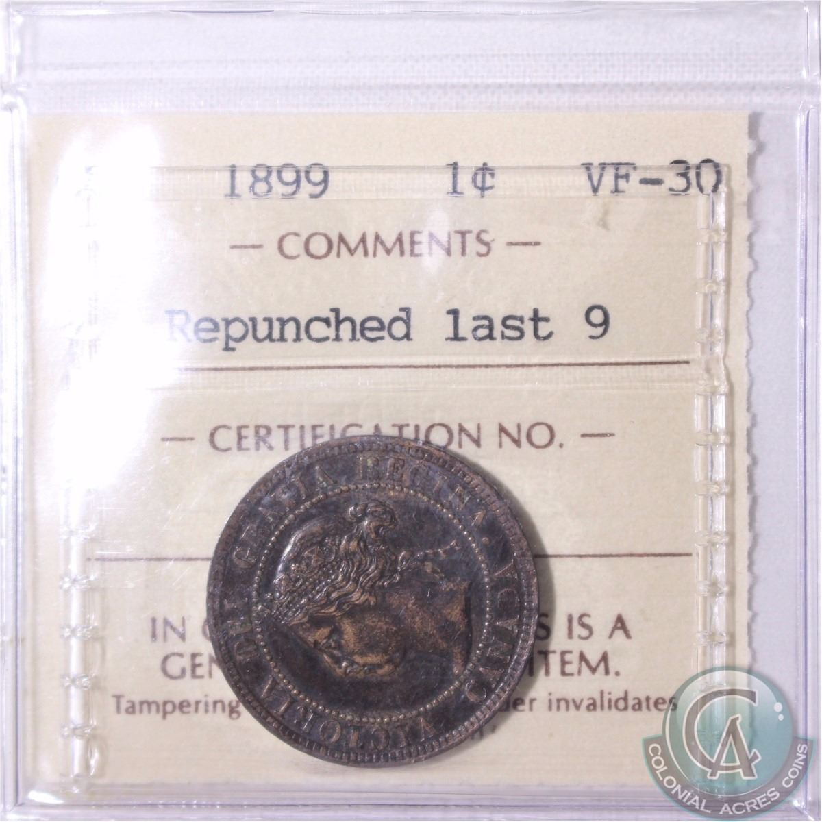 1-cent 1899 Repunched Last 9 ICCS Certified VF-30