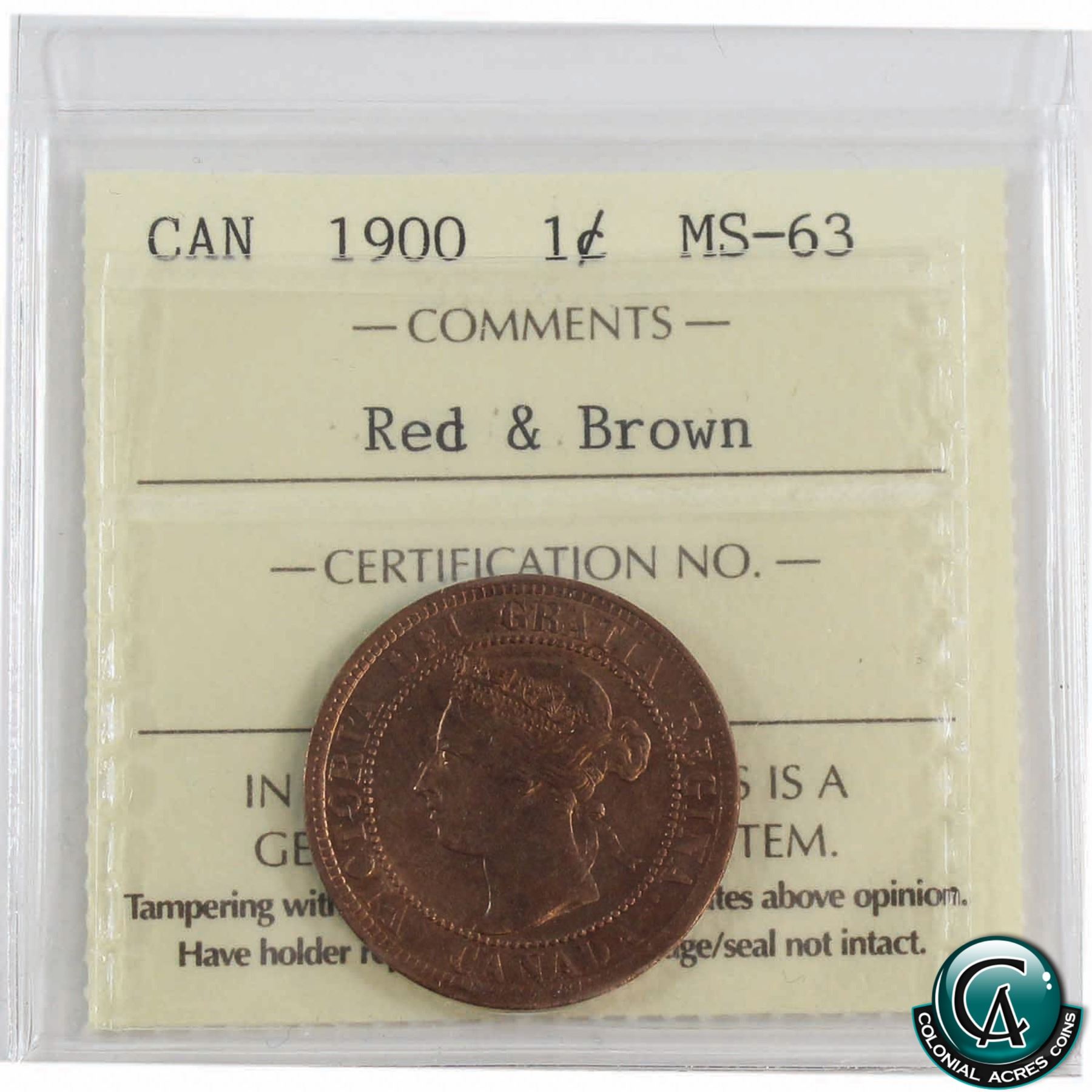 1-cent 1900 Plain ICCS Certified MS-63 Red & Brown. This coin is primarily a deep red tone throughout. The tougher example of the 2 varieties minted that year.
