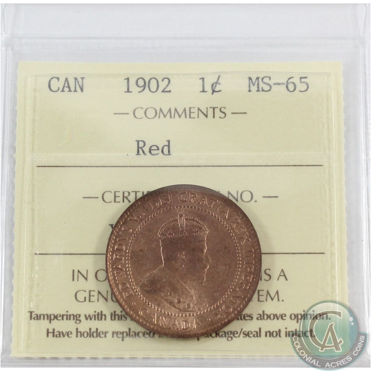 1-cent 1902 ICCS Certified MS-65 RED. Soft satin Fields with near 100% full red coin.