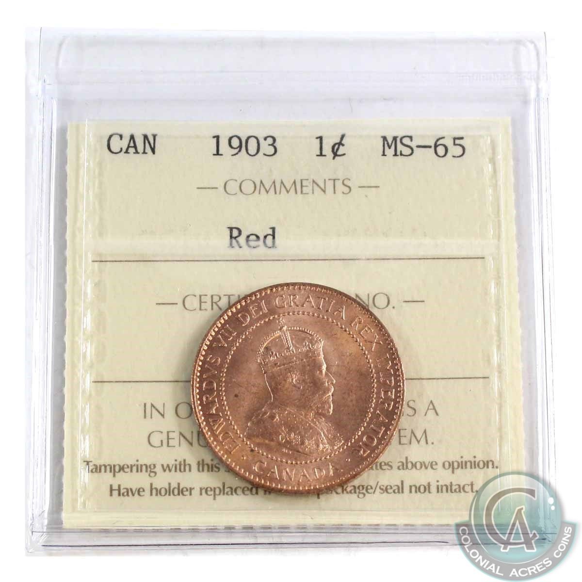 1-cent 1903 ICCS Certified MS-65 Red. Tied for 2nd Highest grade this coin is nearly 100% full lustrous Red!