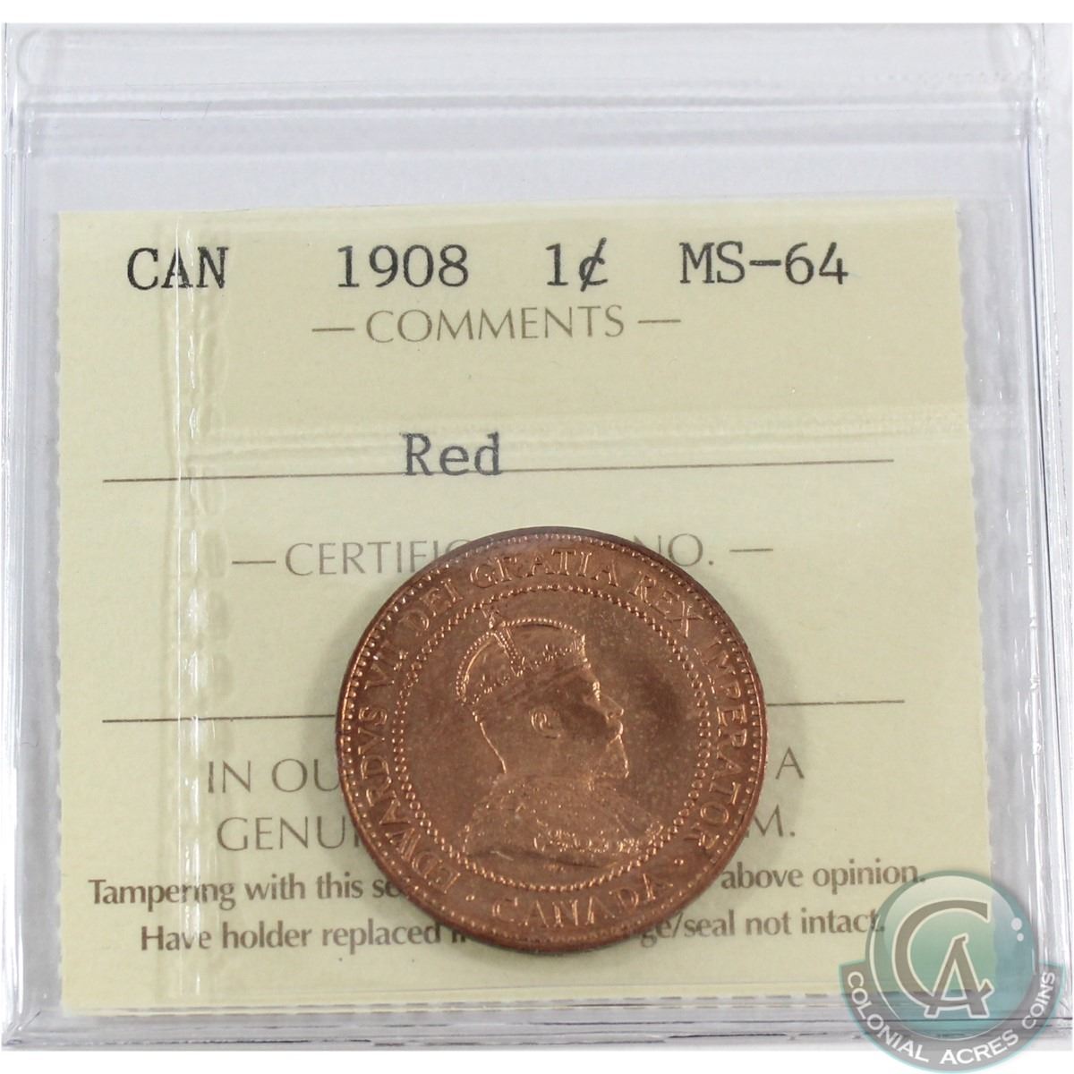 1-cent 1908 ICCS Certified MS-64 RED. Flashy Red coin with strong strike qualities.