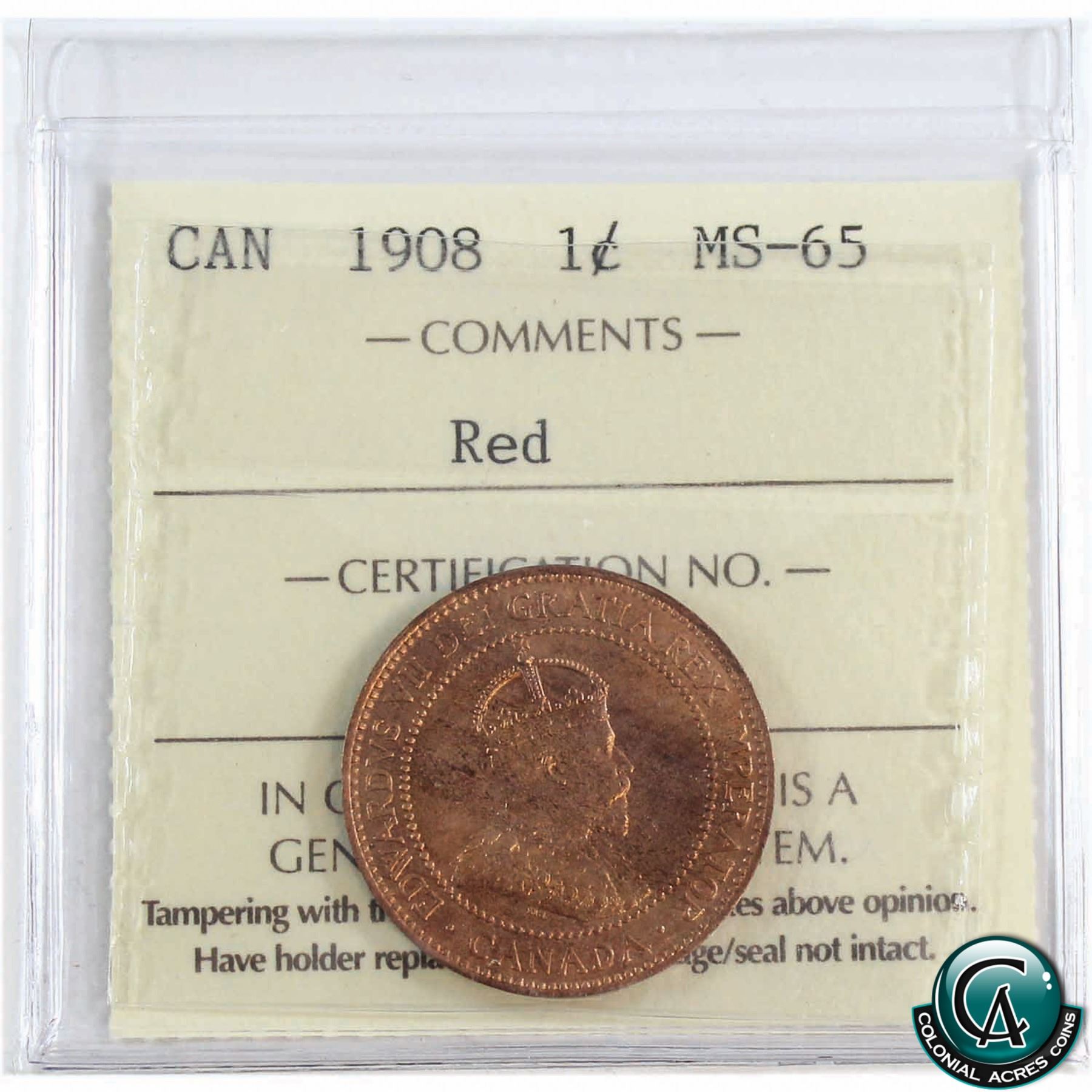 1-cent 1908 ICCS Certified MS-65 RED! A nice first Canadian Mint Issue coin, with full strike details and deep solid red fields.