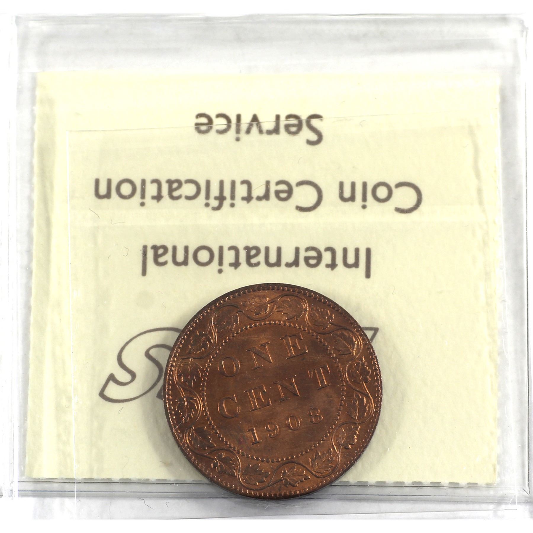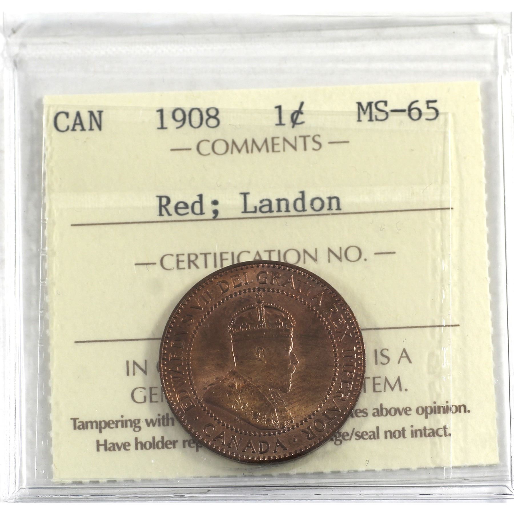 1-cent 1908 Landon ICCS Certified MS-65 RED! Crisp details with vibrant orange tones.