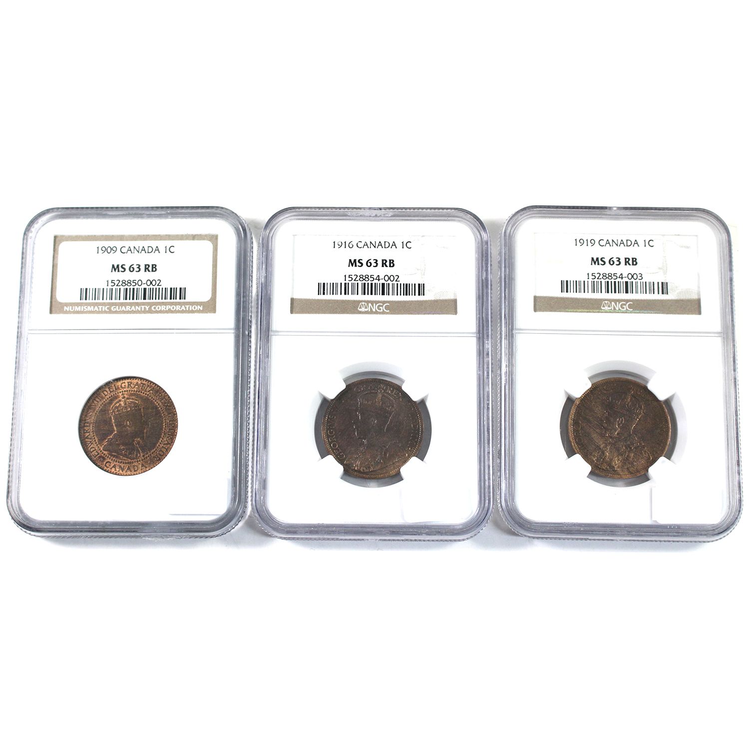 1-cent 1909, 1916 & 1919 NGC MS63 RB. 3pcs.
