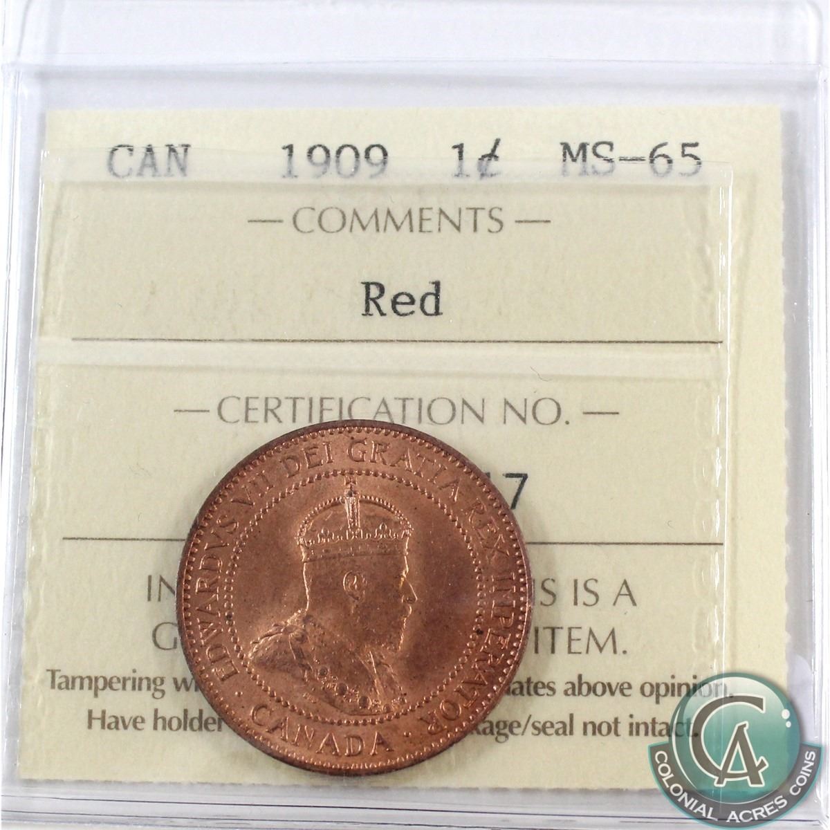 1-cent 1909 ICCS Certified MS-65 Red! A deep cherry red coin with radiant luster. Tied for 2nd Highest grade by ICCS!