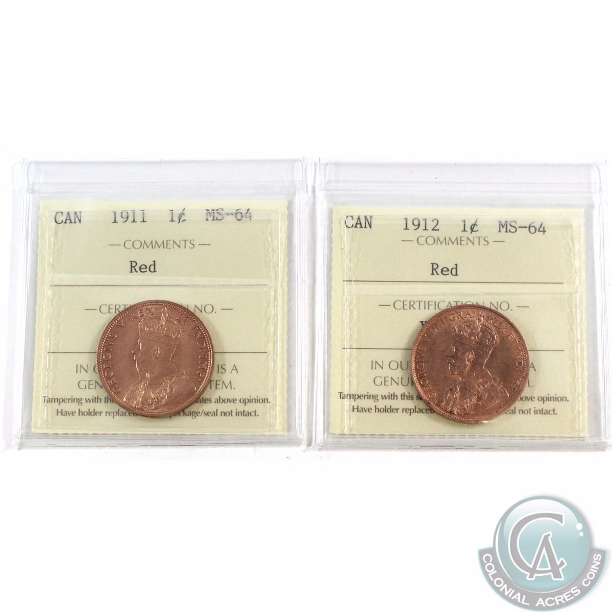 1-cent 1911 & 1912 ICCS Certified MS-64 Red. 2pcs
